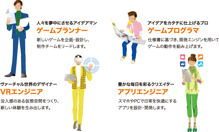 業界第一線の声をキャッチアップ! 本当に実力のつくカリキュラムで学べる ゲーム業界最前線の企業やクリエイターと連携し、最新技術やトレンドをキャッチ。 全国規模のコンテストにも挑戦しながら、発想力や開発技術を磨いていきます。