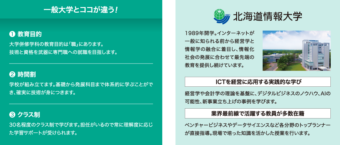 単位認定制度により、本校で取得した単位を北海道情報大学の単位として認め、類似科目を1つにまとめることができます。この独自のカリキュラムで無理なくスムーズに学べる上、学習効果は2倍3倍にアップします。