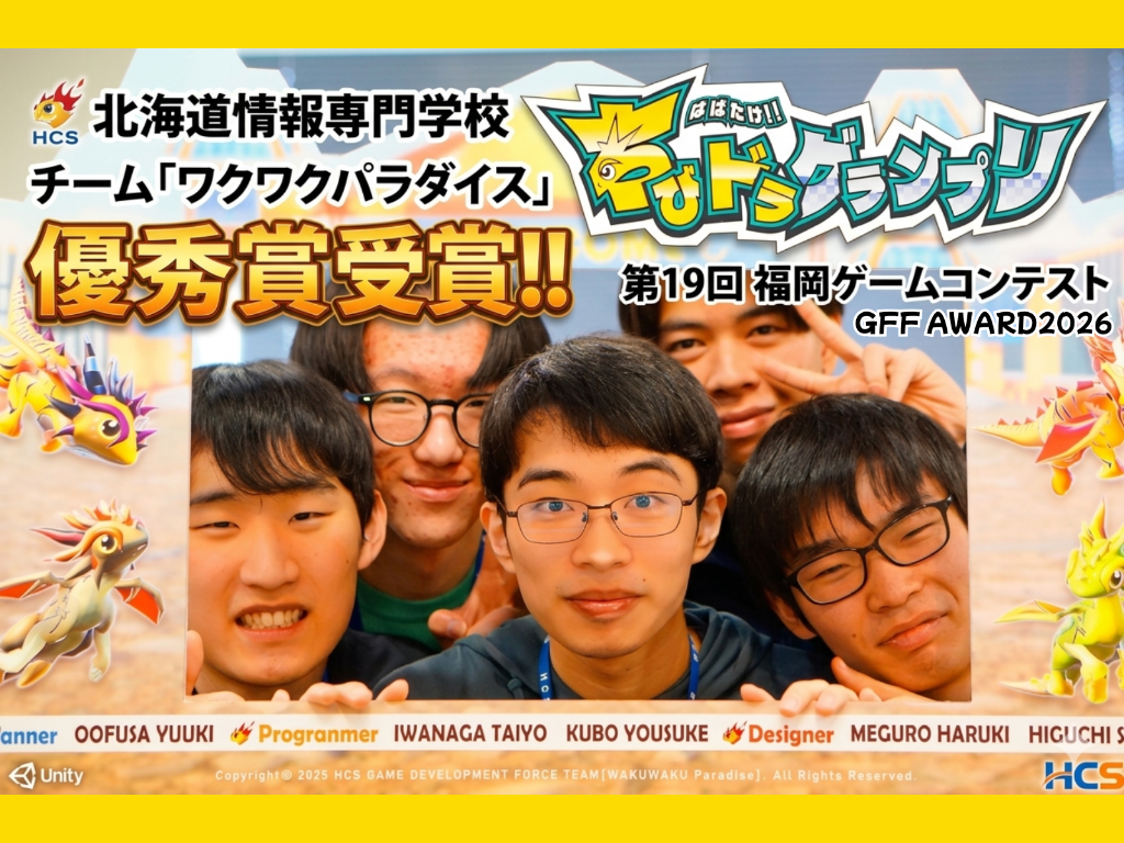 ![]() | 福岡ゲーム産業振興機構(GFF・九州大学・福岡市)が主催する、プロへの登竜門として知られる全国規模のコンテストです。 会場では最終審査や表彰式のほか、著名なゲームクリエイターによる特別トークショーや作品の試遊展示も行われ、 YouTubeでも無料配信されるなど、まさにゲーム業界が注目する熱い祭典です。 北海道から全国へ、自分たちの「おもしろい!」を届けたワクワクパラダイスの皆さん。 本当におめでとうございます! これからの活躍も、学校一同、全力で応援しています! |